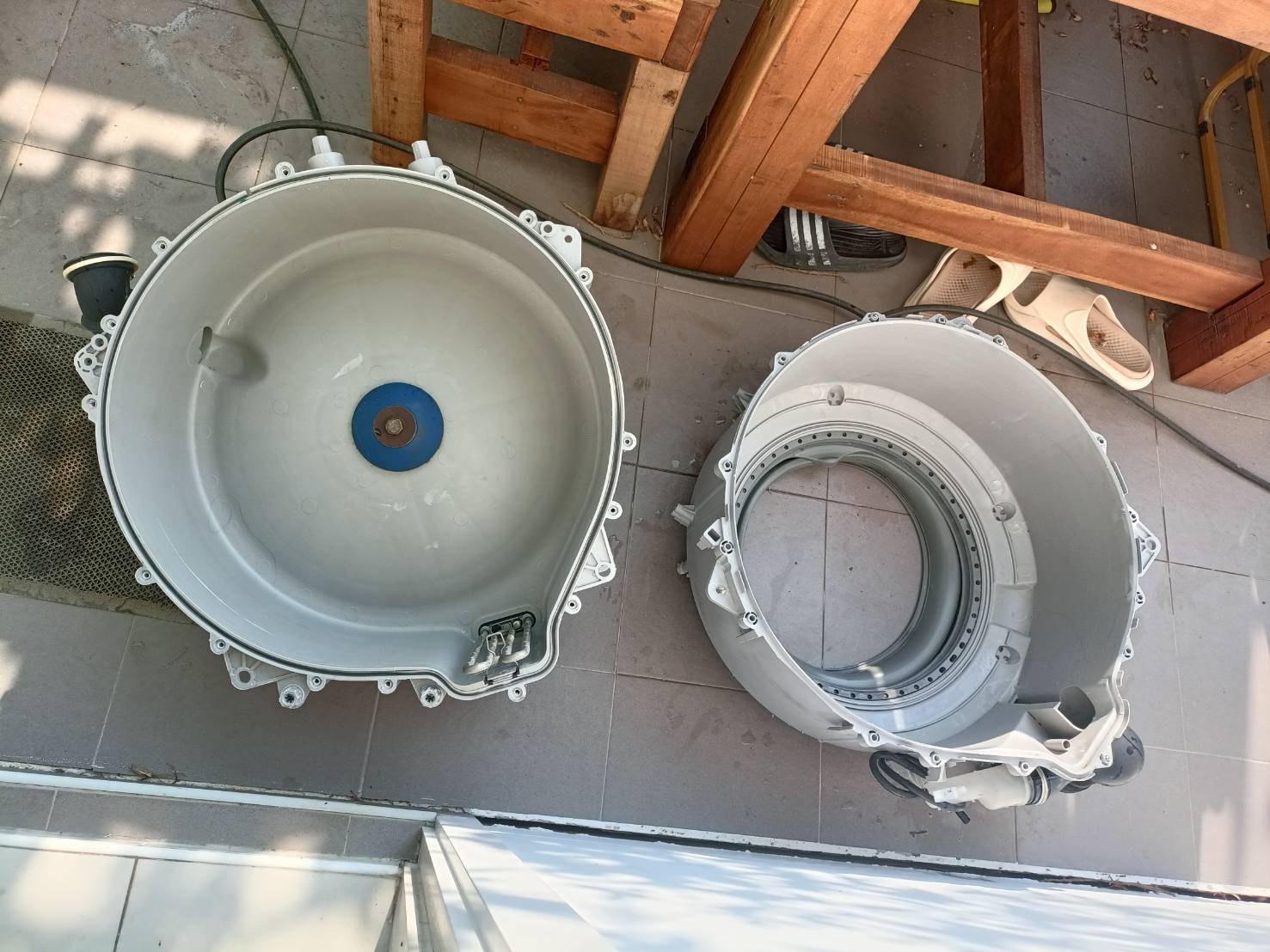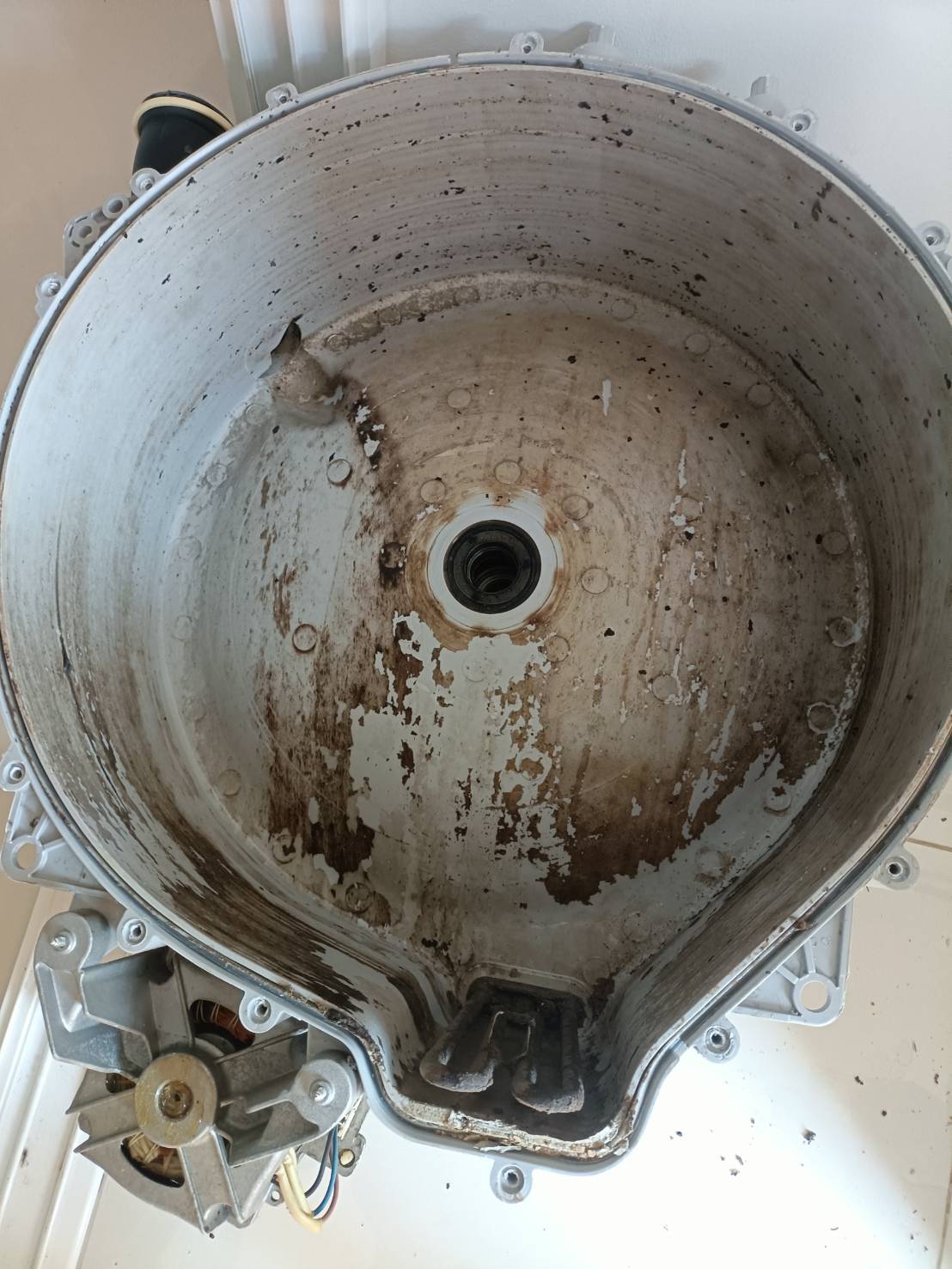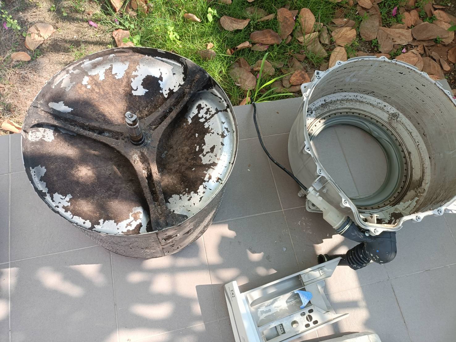ภาพที่เห็นนี้คือผลลัพธ์จากบริการ ถอดถังล้าง แบบล้างลึกจริง จะเห็นได้ชัดว่าก่อนล้างมีคราบสกปรกสะสมจำนวนมาก ทั้งคราบผงซักฟอก เชื้อรา และแบคทีเรีย ซึ่งเป็นสาเหตุของกลิ่นอับและปัญหาซักผ้าไม่สะอาด