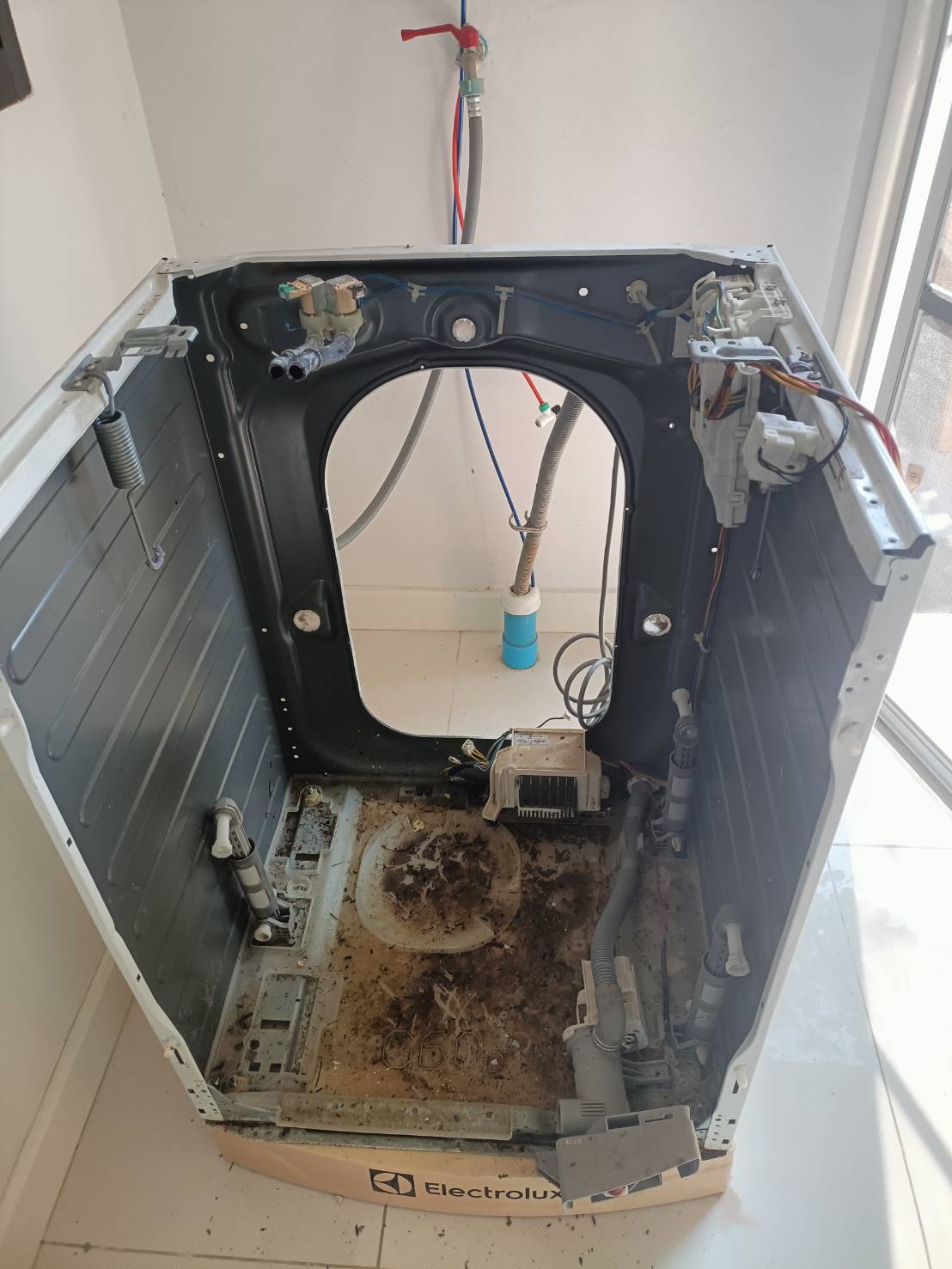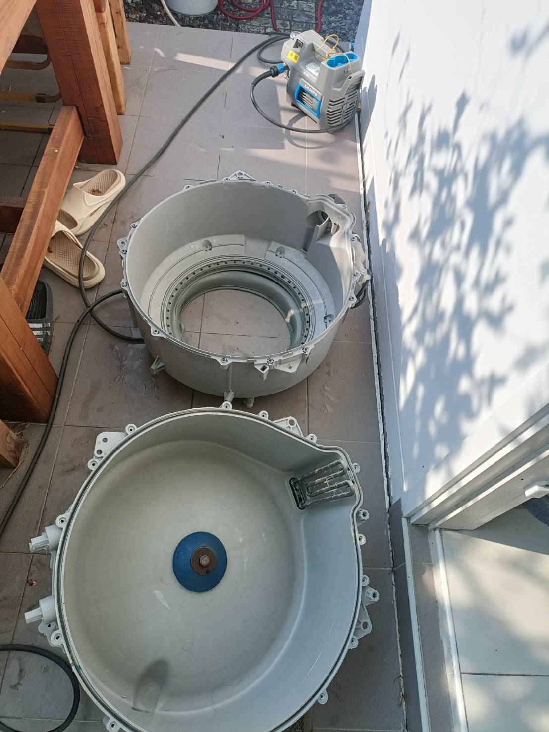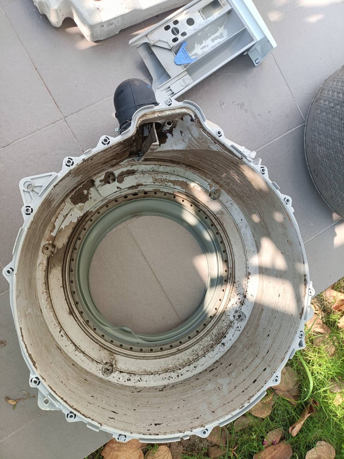 ภาพที่เห็นนี้คือผลลัพธ์จากบริการ ถอดถังล้าง แบบล้างลึกจริง จะเห็นได้ชัดว่าก่อนล้างมีคราบสกปรกสะสมจำนวนมาก ทั้งคราบผงซักฟอก เชื้อรา และแบคทีเรีย ซึ่งเป็นสาเหตุของกลิ่นอับและปัญหาซักผ้าไม่สะอาด